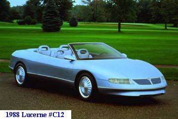 Description: Four-passenger silver-blue coupe was created in GM's Advanced Design Studio No. 1. Lucerne has a fluid design with no door handles or conventional bumpers. The hard tonneau cover is integrated into the lines of both the exterior and interior. Lucerne was transformed into a convertible in 1990. Lucerne is owned by Buick Motor Division, Flint, Mich.